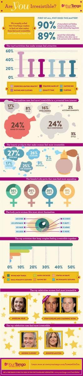 Our Irresistible You (IY) survey left no stone unturned when it comes to what makes men and women feel attractive — and what we're attracted to in a partner. What body parts do women love? (Eyes, lips, hair.) What body parts do they hate? (Unfortunately, too many of them.) What do people find attractive in a partner, and what activities make them feel attractive? And finally, the question you've been dying to have answered: What female celebrity do men find most irresistible? Check out our fun-filled infographic for these factoids and more: