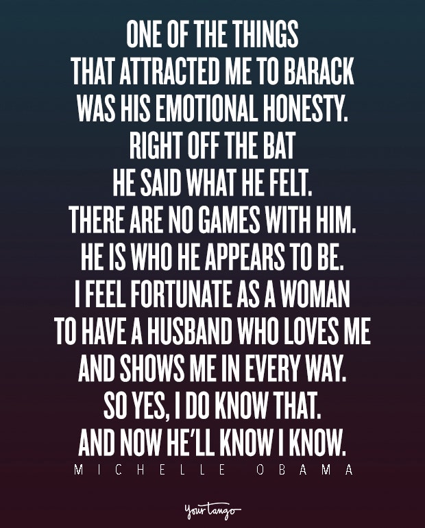 "One of the things that attracted me to Barack was his emotional honesty. Right off the bat he said what he felt. There are no games with him—he is who he appears to be. I feel fortunate as a woman to have a husband who loves me and shows me in every way. So yes, I do know that. And now he'll know I know." — Michelle Obama