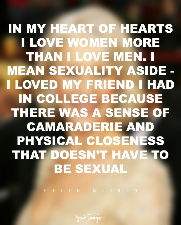 "I actually won my first Golden Globe for something called "Losing Chase". Kyra Sedgwick and me fell in love with each other, and it was a lovely piece about women loving women. In my heart of hearts I love women more than I love men. I mean sexuality aside - I'm heterosexual. I guess I'm heterosexual. I loved my friend I had at college because there was a sense of camaraderie and physical closeness that doesn't have to be sexual." — Helen Mirren