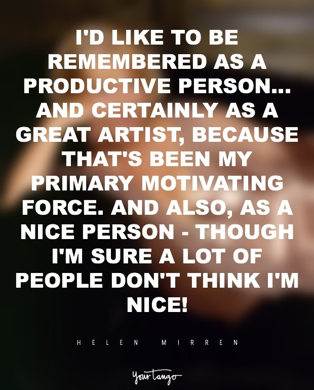 "I'd like to be remembered as a productive person and someone who at least did no harm. And certainly as a great artist, because that's been my primary motivating force. And also, as a nice person—though I'm sure a lot of people don't think I'm nice!" — Helen Mirren
