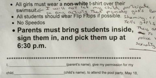 "We know that for many of our families, buying an extra [one-piece] swimsuit for their children would be a luxury they cannot afford," a district spokesperson tells The Huffington Post. "To address the issue of appropriate dress for the swim party, we believed asking the girls to wear T-shirts over their swimsuits was the solution that addressed the issue most sensitively."