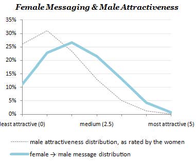 With basic ratings so off-kilter, the two curves suggests some unique interpretations of the female thought process. The most striking one is that the average-looking female believes that most men aren't hot enough for her, but she decides to message them anyway.