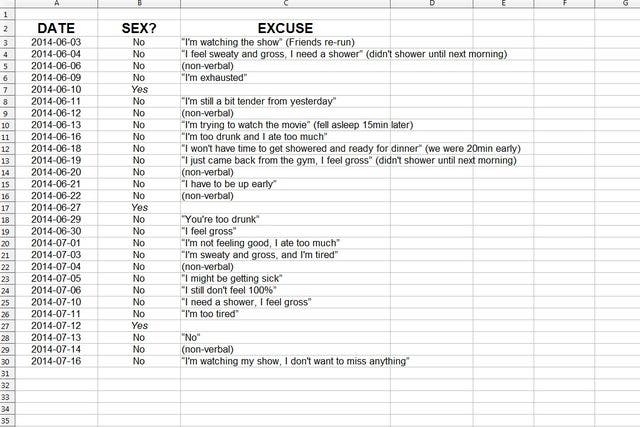 "Attached is a SPREADSHEET of all the times he has tried to initiate sex since June 1st, with a column for my 'excuses', using verbatim quotes of why I didn't feel like having sex at that very moment. According to his 'document', we've only had sex 3 times in the last 7 weeks, out of the 27 'attempts' on his part."