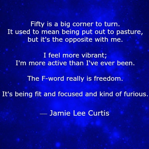 11. "Fifty is a big corner to turn. It used to mean being put out to pasture, but it's the opposite with me. I feel more vibrant; I'm more active than I've ever been. The F-word really is freedom. It's being fit and focused and kind of furious." —Jamie Lee Curtis