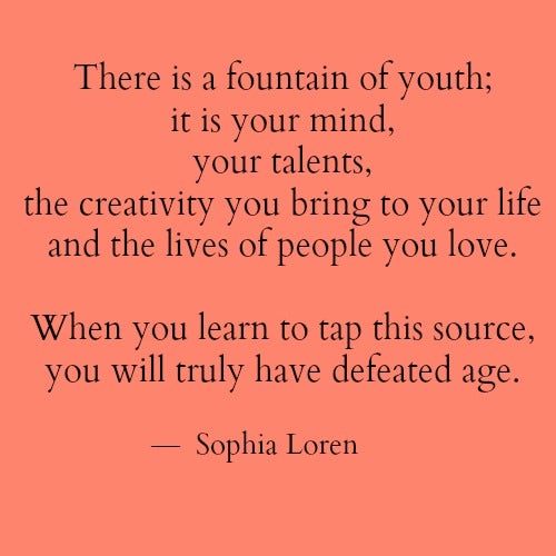 17. "There is a fountain of youth; it is your mind, your talents, the creativity you bring to your life and the lives of people you love. When you learn to tap this source, you will truly have defeated age." —Sophia Loren