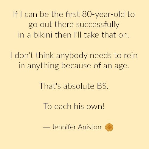 18. "If I can be the first 80-year-old to go out there successfully in a bikini then I'll take that on. I don't think anybody needs to rein in anything because of an age. That's absolute BS. To each his own!" —Jennifer Aniston