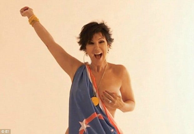 Oh yeah, someone already beat you to it, Caitlyn. In a 2007 episode of Keeping Up With The Kardashians (shown above), Caitlyn's ex Kris Jenner did the exact same thing and posed nude with nothing but the Olympic gold medal and an American flag sheet. But it wasn't for a major magazine like Sports Illustrated, so I guess the joke's on you Kris...