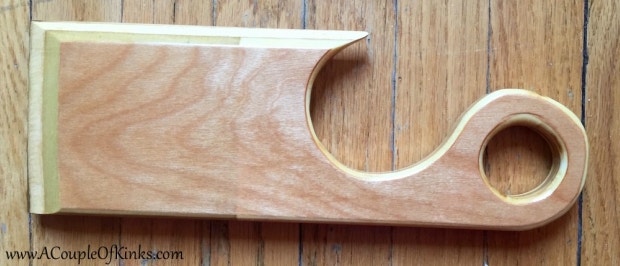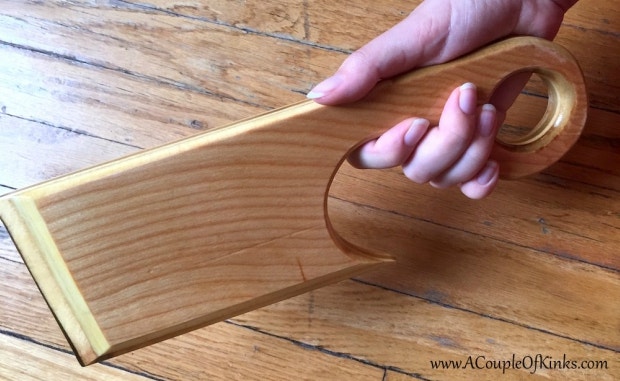 The paddle we received was made of birch plywood, cut with a scroll saw and shaped with a router. It was then sanded smooth, filled with butcher-block wax, and covered with polyurethane. Both materials protect it from moisture and bacteria, as well as give it a nice shiny finish.