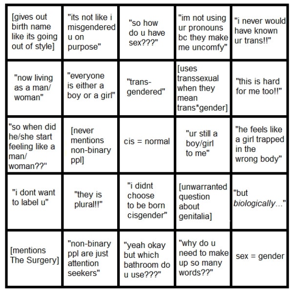 This isn’t for you, but for you to give to your transfriend. They keep it with them and mark it every time you say or do something that is on the card. You can play “Connect 5” or fill the whole board. Maybe your friend will win the game, but hopefully they ditch you first. Because to be honest, if you’re saying and doing these things, you’re an asshole.