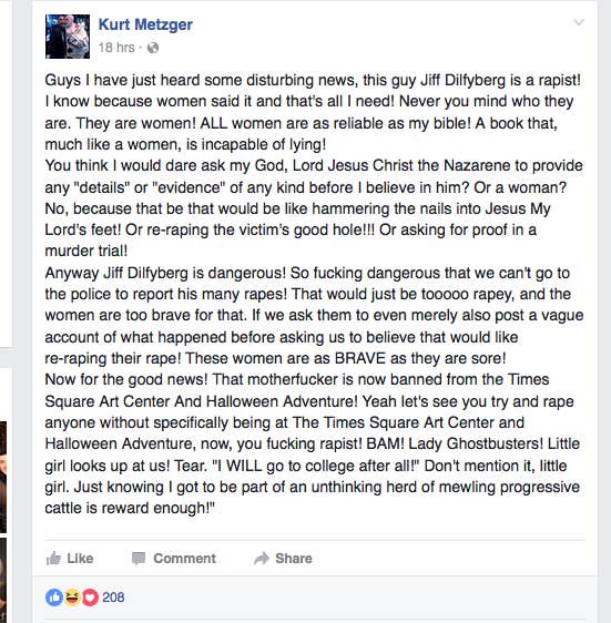 YouTubeYou may have heard the story that's been going around involving Kurt Metzger, a writer for Inside Amy Schumer, and the now-deleted Facebook post in which he went off on women in comedy who came forward with sexual assault accusations against "a male comic who [has been subsequently] banned from the [Upright Citizens Brigade] events."