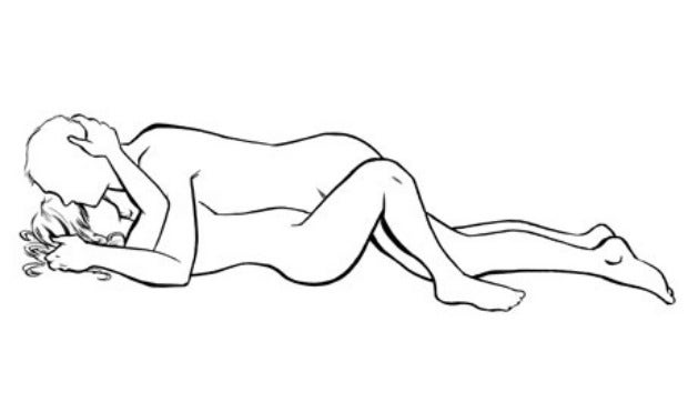To get into the Cat, have your partner rest on his forearms, elbows, thighs, and upper knees, slightly laying on your body as he evenly distributes his weight and relaxes his muscles. He should maintain as much body contact with you as is comfortable and possible, without crushing you.