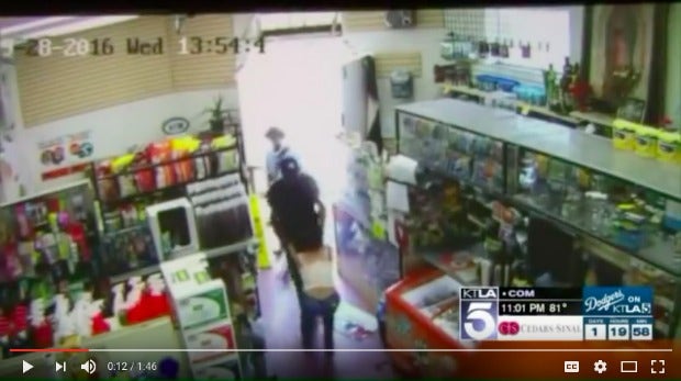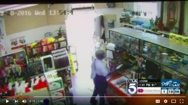 Still, he goes about his business, allowing the kidnapper to leave the store dragging this poor woman out without doing a thing.
