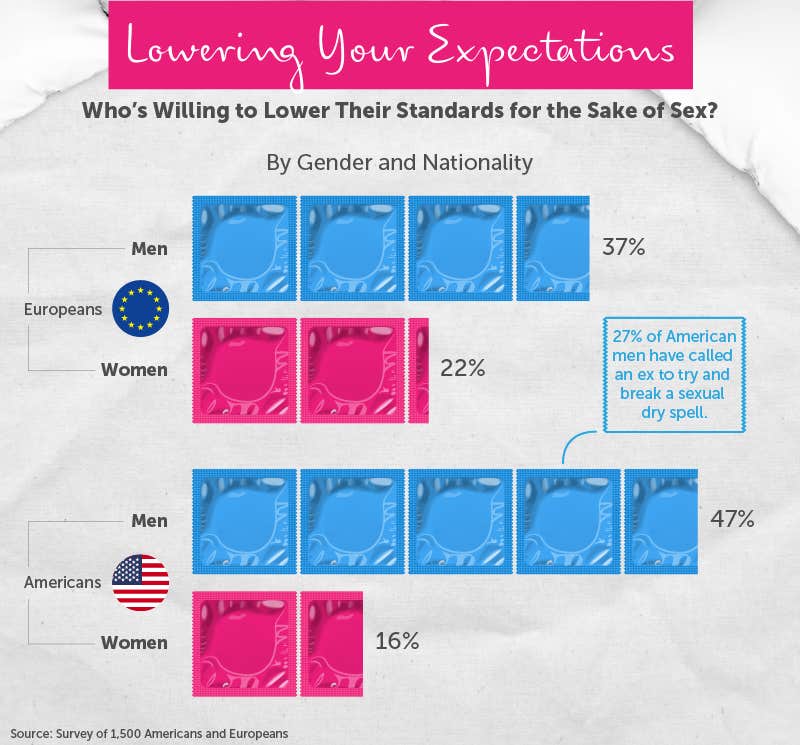 For European women, 22 percent of them were willing to lower their standards for sex while 37 percent of European men were willing to do the same for the sake of their sex lives.