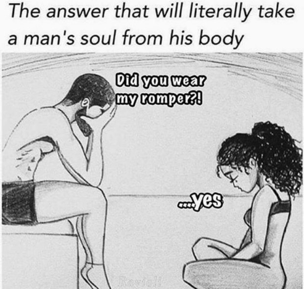 "The answer that will literally take a man's soul from his body. Did you wear my romper?! ... Yes."
