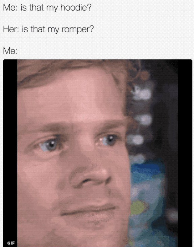 "Me: Is that my hoodie? Her: Is that my romper? Me: ."