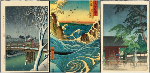 The art of Japanese woodblock printing dates to the 8th century, and here are some examples of what I'm talking about:
