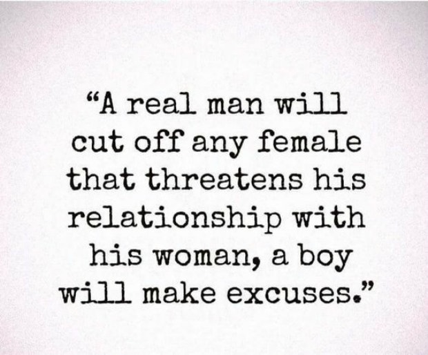 33. "A real man will cut off any female that threatens his relationship with his woman; a boy will make excuses."