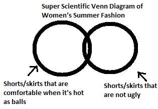 I honestly think that new lines of shorts, dresses, and skirts get slightly shorter every year. There is little compromise between feeling comfortable wearing the same pair of shorts out in public and comfortable wearing them in 90-degree weather.