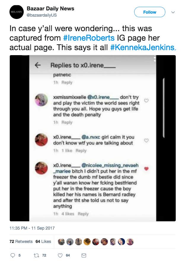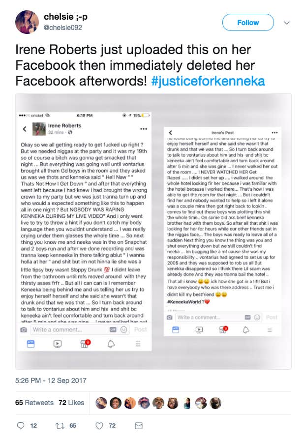 A video also came out that supposedly showed Roberts at the police station, but that hasn't been confirmed. There have been screenshots that supposedly show Roberts posting on Facebook that she didn't set anything up, and Jenkins wasn't being assaulted on her live video, but that three boys who showed up at her party took her friend and killed her.