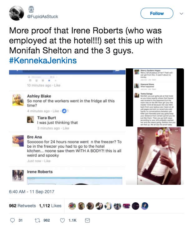 None of that has been confirmed, but people are speculating that Roberts either set up the crime herself or assisted Shelton and knew where to hide her body because she worked at the hotel. People commenting on this theory also believe that Jenkins was assaulted by multiple men.