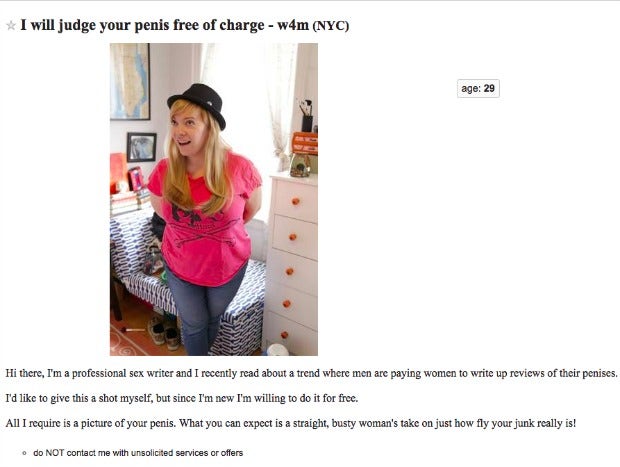 I decided after a few minutes of contemplation (maybe just one, 'cuz I'll be real, I was ready to see some strangeness) and after getting my boyfriend's OK to put up an ad on Craigslist offering to judge men's penises free of charge. It was simple and upfront.