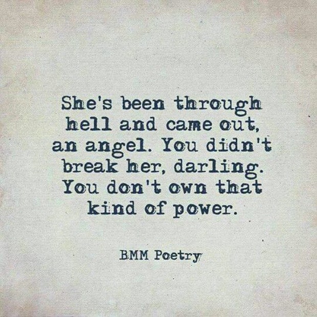 "She's been through hell and came out, an angel. You didn't break her, darling. You don't own that kind of power." — BMM Poetry