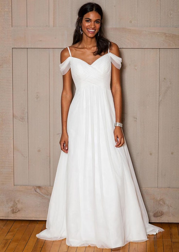 A-line princess cut sweep/brush train dress. This dress looks like it stepped right out of a Jane Austen novel. If you've found your Mr. Darcy then halt your search for the perfect dress because here it is.
