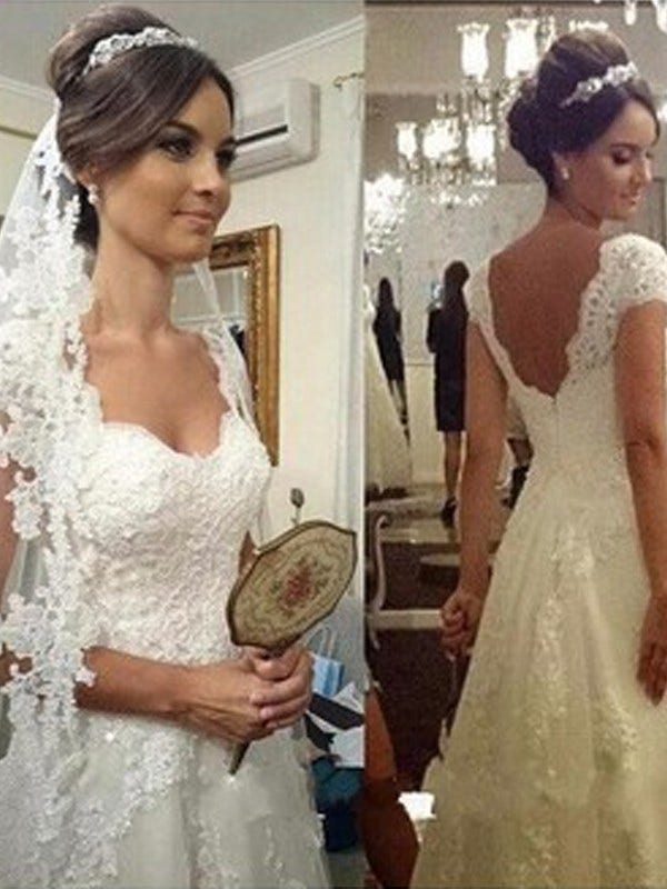 A-LINE PRINCESS V-Neck with lace flower pattern. This dress is fun and flirty especially for a spring-time wedding! The back scoops down to show it off, so try not to wear a veil the whole night!