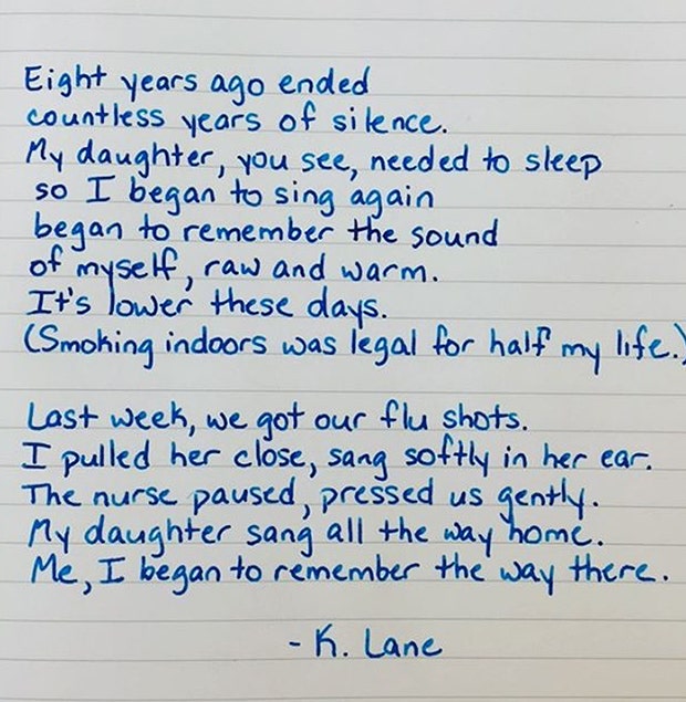 Here’s another example of an instapoem that features love, as is expected, but this is a more innocent familial love. Even the way in which it was written, handwritten in blue marker on a lined paper, lends an innocent child-like touch to it.
