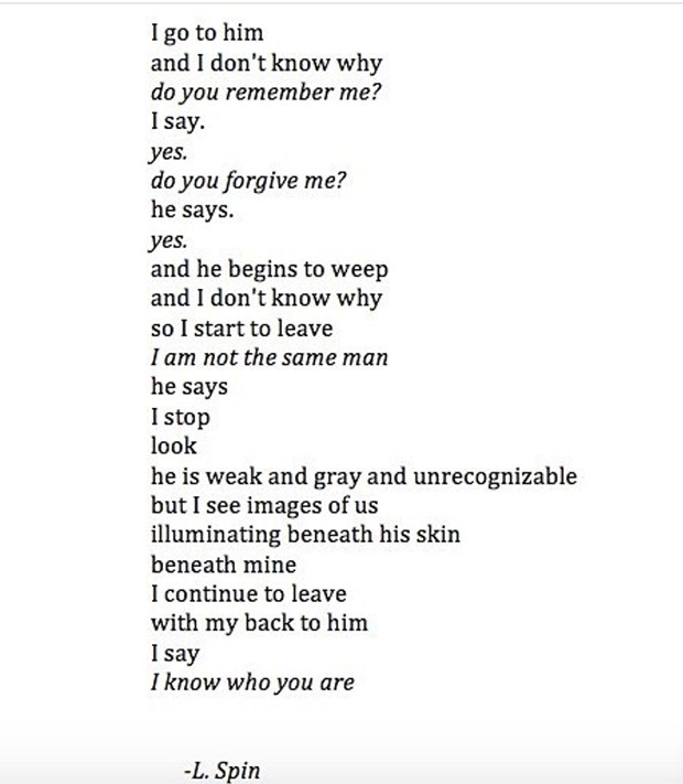 This is one of the more traditional poems because it has a nice length and its concept is presented in an abstract way. It also delivers in emotion which sometimes gets lost when trying to be poetically abstract. N.C. achieves this by balancing abstract ideas with concrete details.