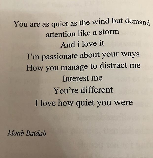 This poem written by Maab Baidab, can be found on Divine Bevy’s Instagram. The best line of the poem is the first line because it says that the speaker’s loved one has an attention-grabbing personality without needing to be loud.