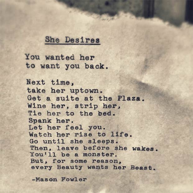 Like the poem before this one, this YourTango featured artist gets one of their sensual poems on this list. Mason Fowler specializes in writing about love, sex, one night stands, but he does it in a grittier and more sexual tone then Lala Vida.