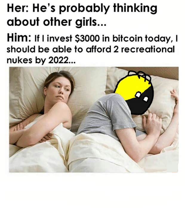 "Her: He's probably thinking about other girls... Him: If I invest $3000 in bitcoin today, I should be able to afford 2 recreational nukes by 2022."