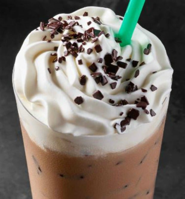 Starbucks' description:"Dark mocha sauce and white chocolate mocha sauce are combined with steamed milk to create rich swirls. It’s finished with whipped cream and chocolate sequins."