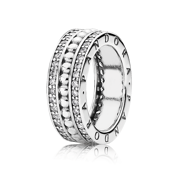 This ring will make a statement, and a good one too! Beaded details, twin lines of sparkling stones and a stylish Pandora logo make this ring truly unique.