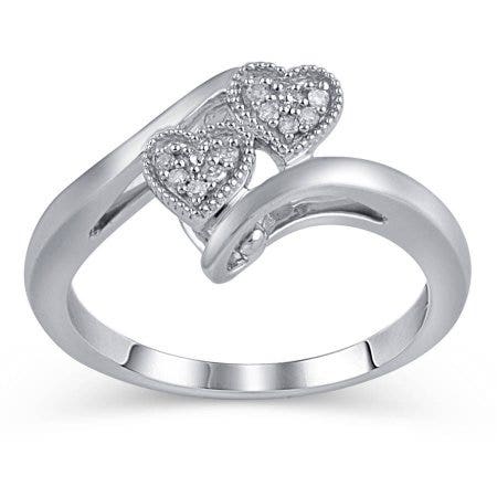 Two heart-shaped cubic zirconia stones on this sterling silver ring help symbolize the bond of love you have. Now that is sweet.