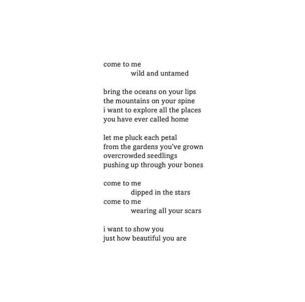 "Come to me, wild and untamed. Bring the oceans on your lips, the mountains on your spine; I want to explore all the places you have ever called home. Let me pluck each petal from the gardens you’ve grown, overcrowded seedlings pushing up through your bones. Come to me dipped in the stars, come to me wearing all your scars. I want to show you just how beautiful you are.” – Tyler Kent White