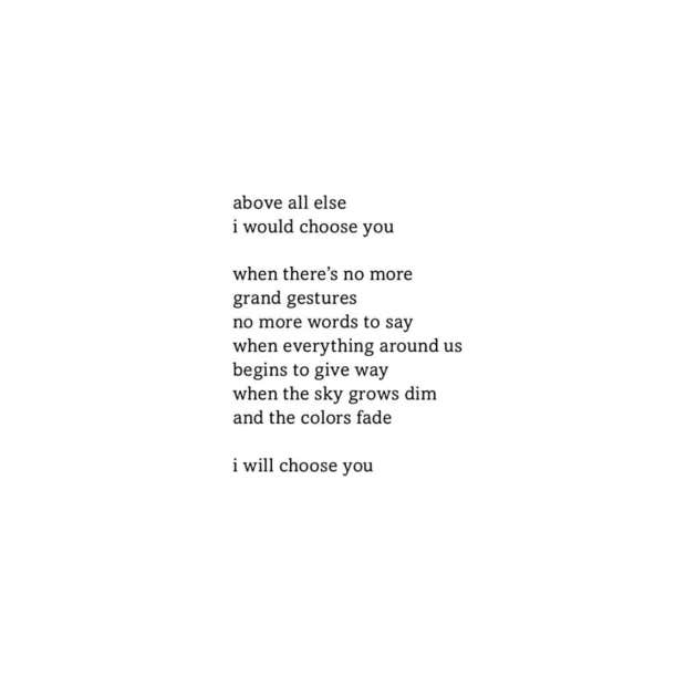 "Above all else, I would choose you. When there’s no more grand gestures, no more words to say, when everything around us begins to give way, when the sky grows dim and the colors fade, I will choose you.” – Tyler Kent White