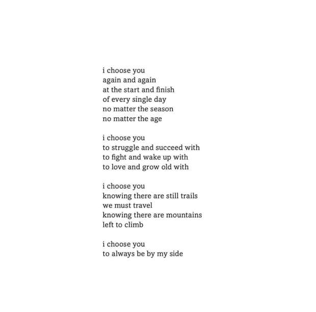 "I choose you, again and again at the start and finish of every single day, no matter the season, no matter the age. I choose you to struggle and succeed with, to fight and wake up with, to love and grow old with. I choose you, knowing there are still trails we must travel, knowing there are mountains left to climb. I choose you to always be by my side.” – Tyler Kent White
