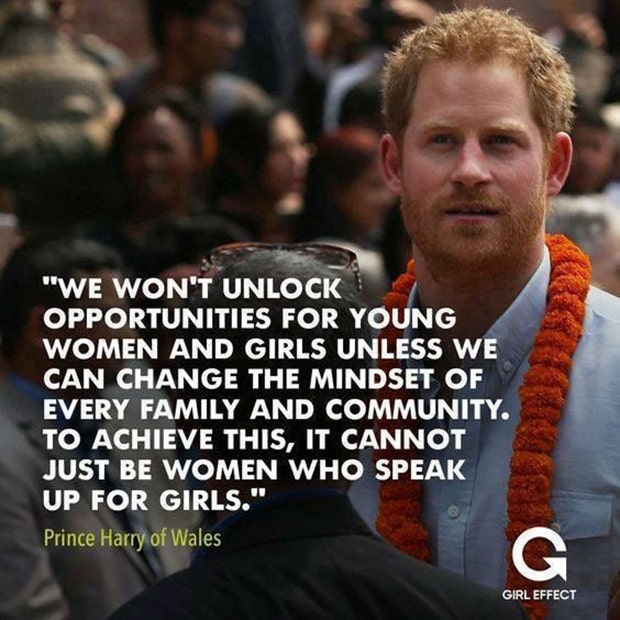 “We won’t unlock opportunities for young women and girls unless we can change the mindset of every family and community. To achieve this, it cannot just be women who speak up for girls. ” -Prince Harry of Wales