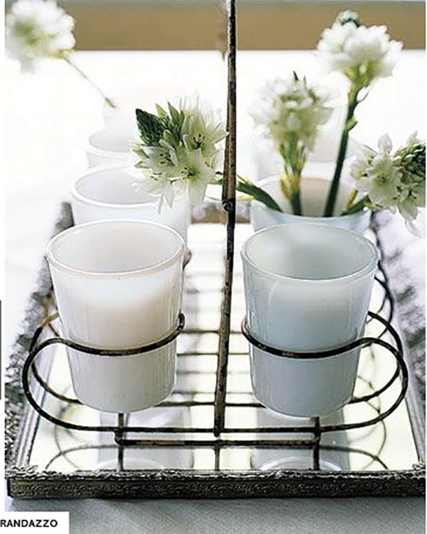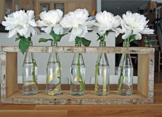 For a rustic touch, try this bottle carrier flower arrangement. You can choose any color and size tumblers you want, just make sure to accent it with some beautiful fresh flowers. It’s an interesting take on a traditional flower vase centerpiece.
