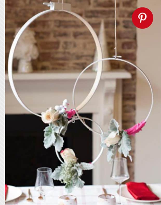 These hanging gardens are easy to make and turn each table into an enchanted forest. Some floral wire and fresh flowers turn these hoops into a centerpiece truly fit for a whimsical wedding. Use the floral tape and wire to attach the dusty miller and fresh flowers around the hoop. Hang it from clear fishing line in your event space.