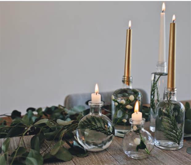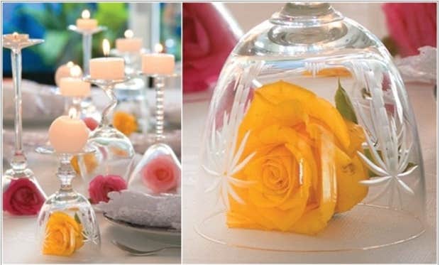 This simple centerpiece allows you to use wine glasses in a whole new way. Simply flip it upside down, and put a candle on top. You can put anything inside the wine glass, so choose something pretty that goes with your theme. Get creative with this one.