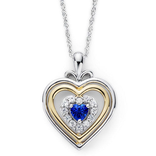 This is a show stopper. Sapphire with a two-tone heart pendant, there are not many necklaces this beautiful. Your wife will love it! There are not a lot of women as beautiful as your wife.