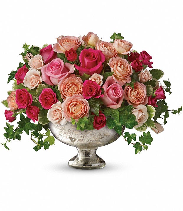If you and your hubby are having a extravagant celebration then this arrangement is you best choice. The assortment of pinks and white roses comes with a Mercury Glass Bowl. It will look best as a centerpiece or beside the cake.