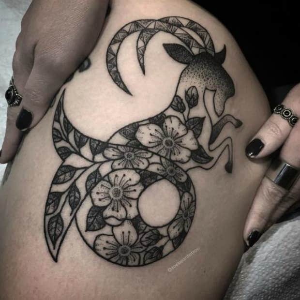 Everyone loves flowers! But instead of exchanging the stars in a constellation tattoo with flowers, you can wrap some flowers around the Capricorn symbol and get the same effect. Pretty and unique!