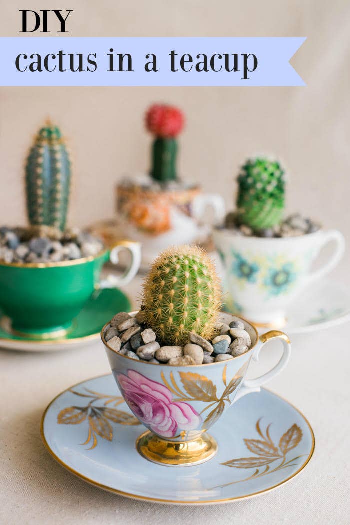 Give the gift of something that is nearly impossible to kill: a cactus. They can forget to water it and it's no big deal. Add potting soil, small rocks and a succulent plant to a vintage teacup.
