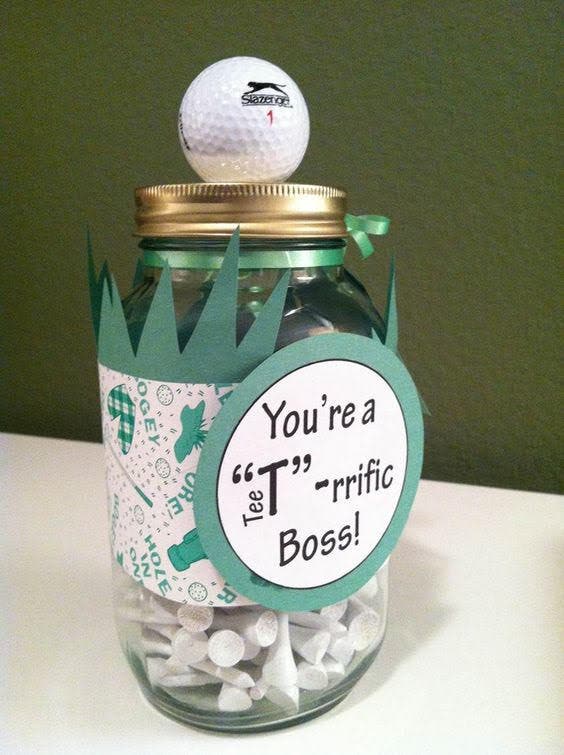These golf tees are presented in a bit of a sappy way but are perfect to encourage your boss to take some time out of the office. Add them to a mason jar and decorate it with construction paper or labels you print on the office computer when no one is looking. Glue a golf ball to the lid and you're done!