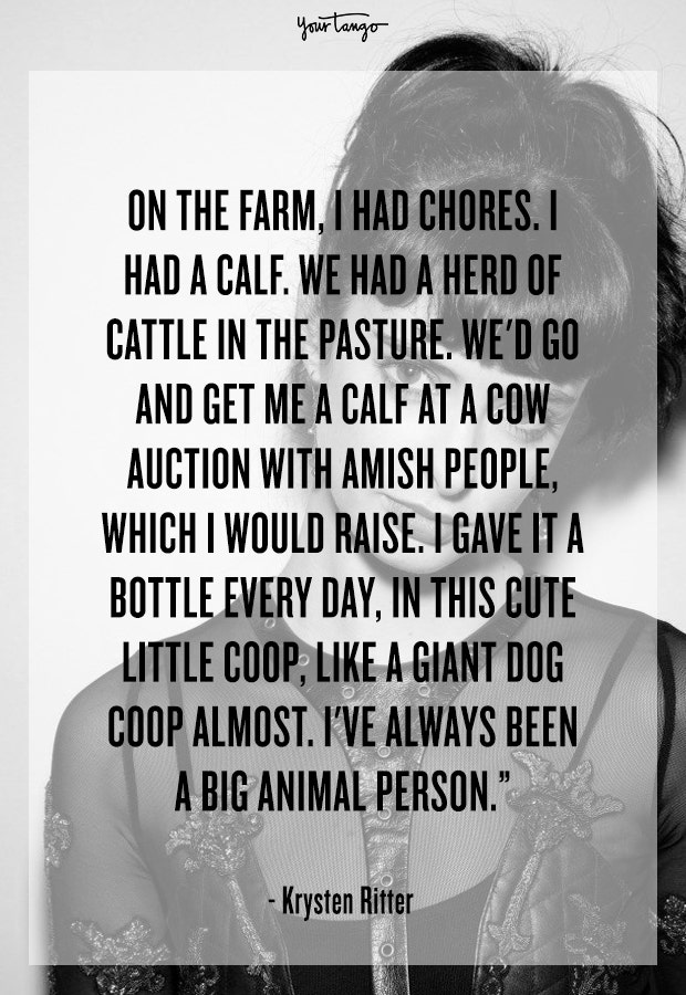 “On the farm, I had chores. I had a calf. We had a herd of cattle in the pasture. We'd go and get me a calf at a cow auction with Amish people, which I would raise. I gave it a bottle every day, in this cute little coop, like a giant dog coop almost. I've always been a big animal person.” — Krysten Ritter