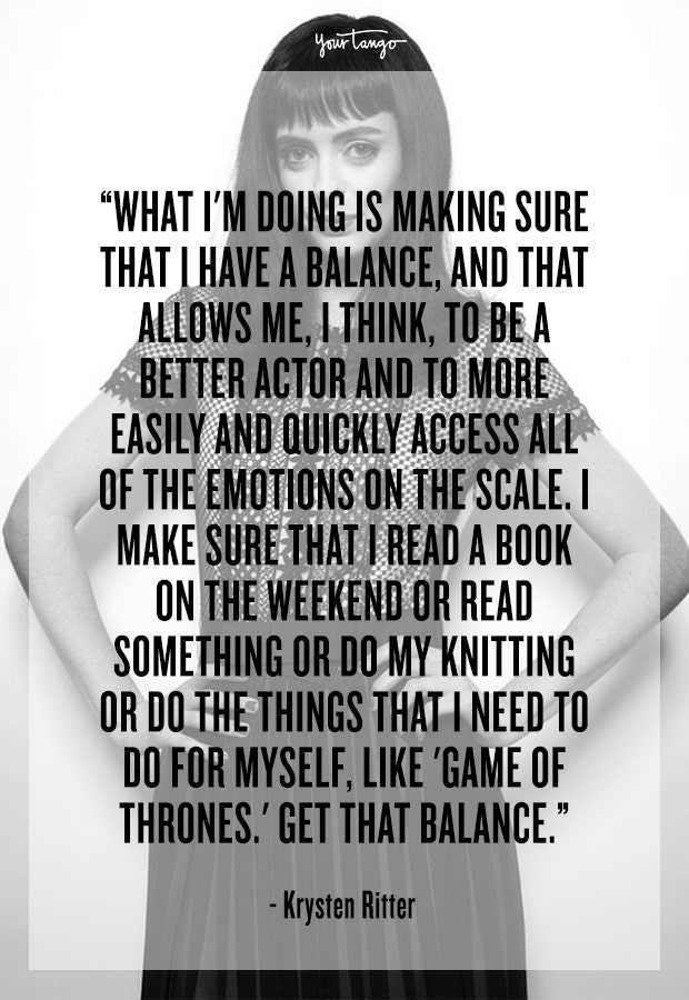 “What I'm doing is making sure that I have a balance, and that allows me, I think, to be a better actor and to more easily and quickly access all of the emotions on the scale. I make sure that I read a book on the weekend or read something or do my knitting or do the things that I need to do for myself, like 'Game of Thrones.' Get that balance.” —Krysten Ritter